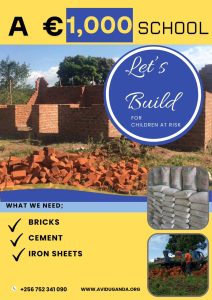WE WANT TO BUILD AN AFFORDABLE SCHOOL FOR THE CHILDREN AT RISK BOTH AT OUR RESTORATION HOME AND THE COMMUNITY OF MISANGA VILLAGE. JOIN US. THIS IS A JOURNEY WORTH WALKING WITH US BECAUSE OF ITS GENERATIONAL IMPACT ON THE LIVES OF CHILDREN STUCK IN ABUSE BOTH PHYSICAL AND EMOTIONAL. JOIN US TO BREAK THAT CYCLE COMPLETELY THROUGH PROVIDING EDUCATION SERVICES TO THESE CHILDREN. LET’S BUILD A SCHOOL FOR ONLY €1,000
